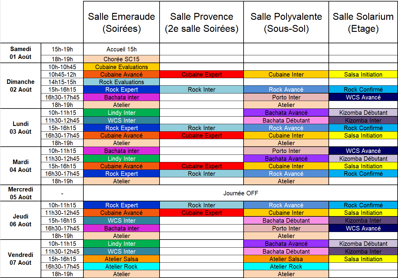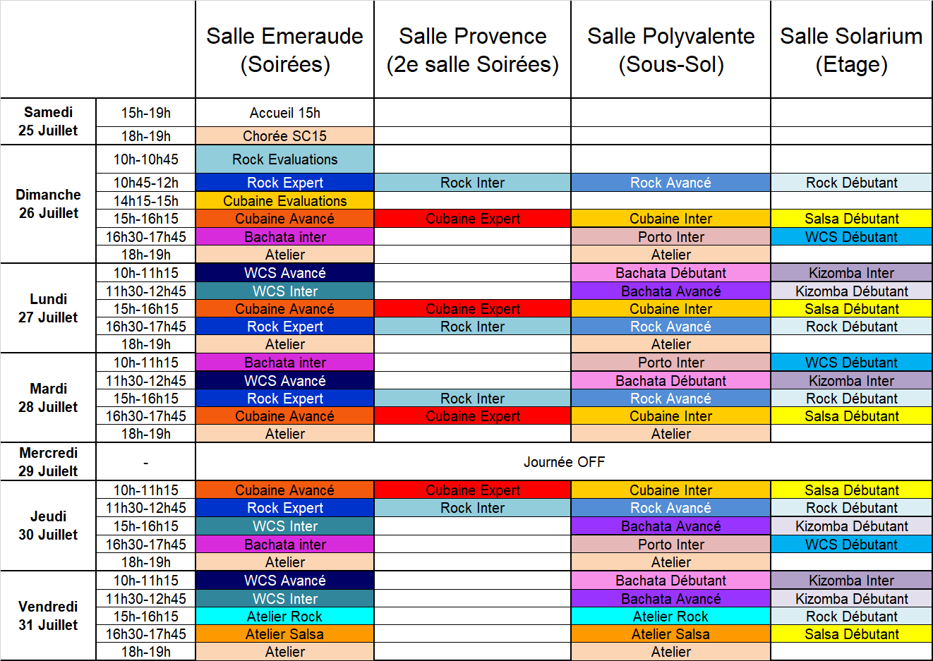 Un séjour de danse en Pension Complète basé sur le partage, les rencontres, l’amusement et la danse bien sûr ! Au programme des cours de Rock, Salsa Cubaine et Portoricaine, Bachata, West Coast Swing, Kizomba, Lindy Hop, des soirées, de la détente et des activités diverses et variées.